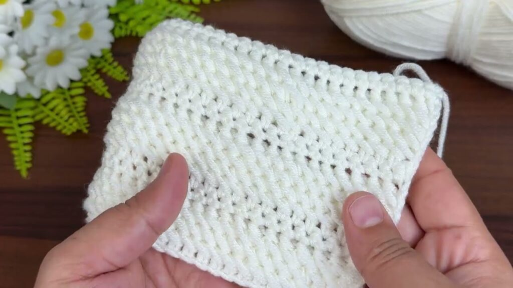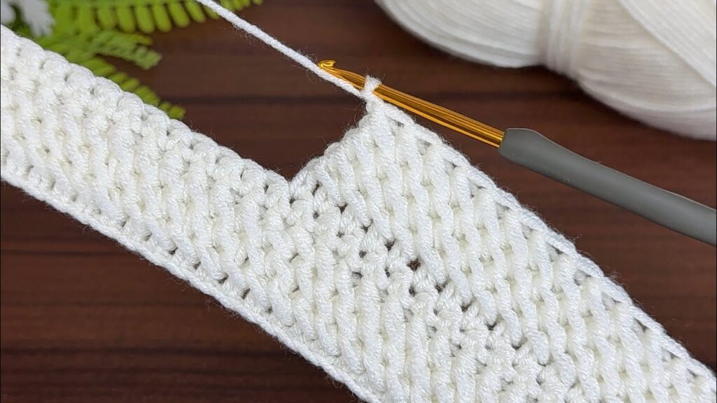It looks like you’re working on a crochet project — the image shows a neat row of stitches being shaped with a V or notch pattern in white yarn using a crochet hook.