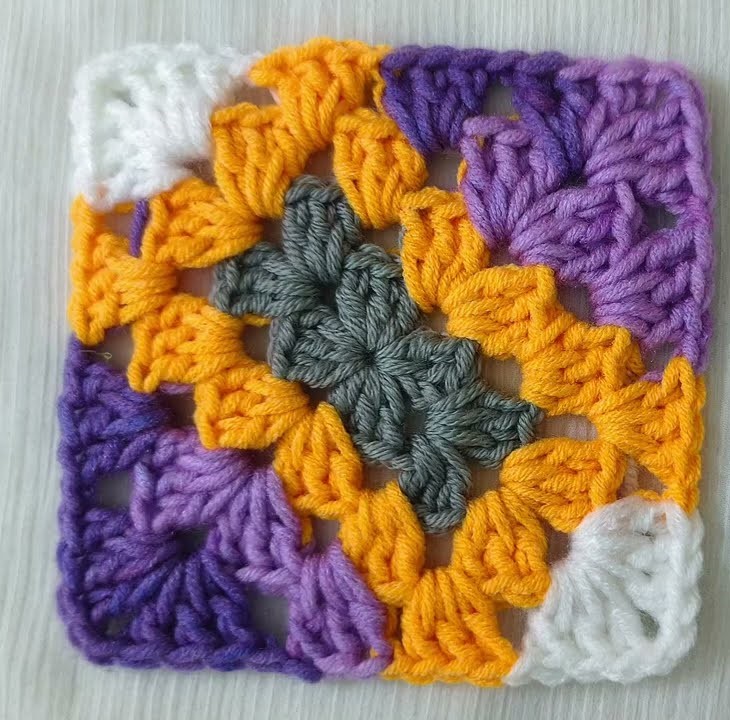 Perfect π step-by-step instructions so you can follow easily β especially if you want your crochet square to look exactly like the one in the picture (gray center β orange β purple β white corners).