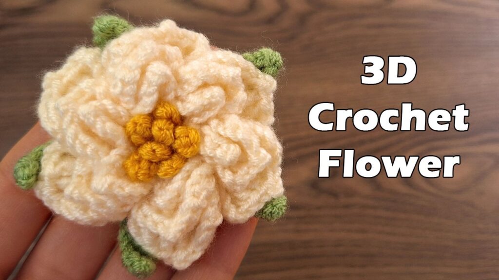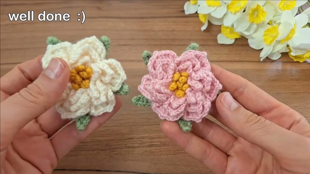- Yarn: 3 colors (Yellow for center, Cream for petals, Green for leaves)