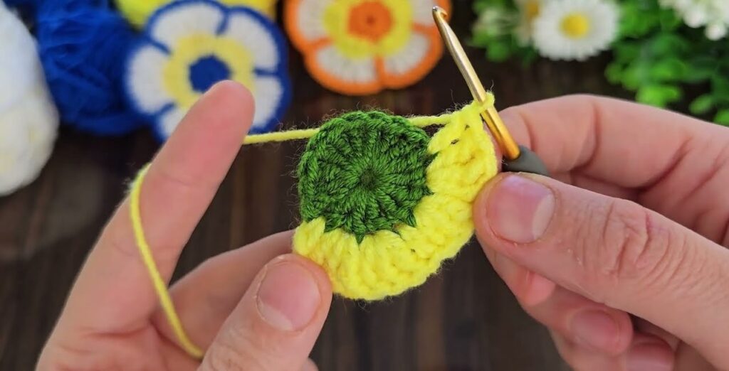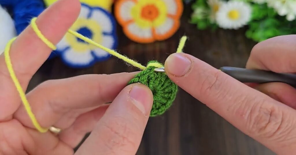 - Don’t fasten off yet — you’ll use this color to create the petal base next.