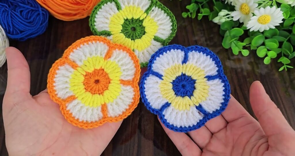 crocheted flower motifs, which are likely made using yarn and a crochet hook. These motifs can be used for coasters, blankets, or decorative projects. Here’s a simple step-by-step guide to make a similar flower:
