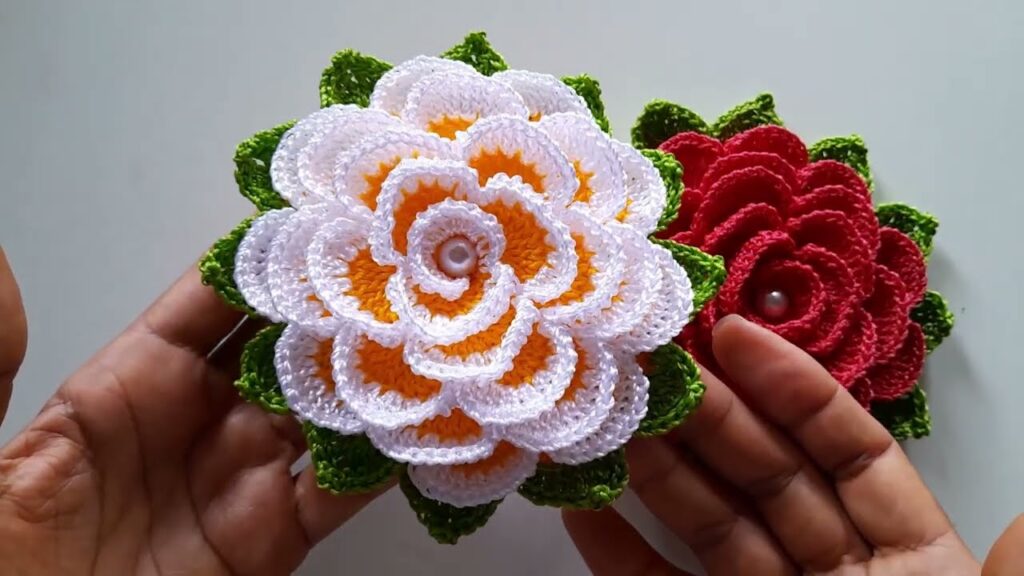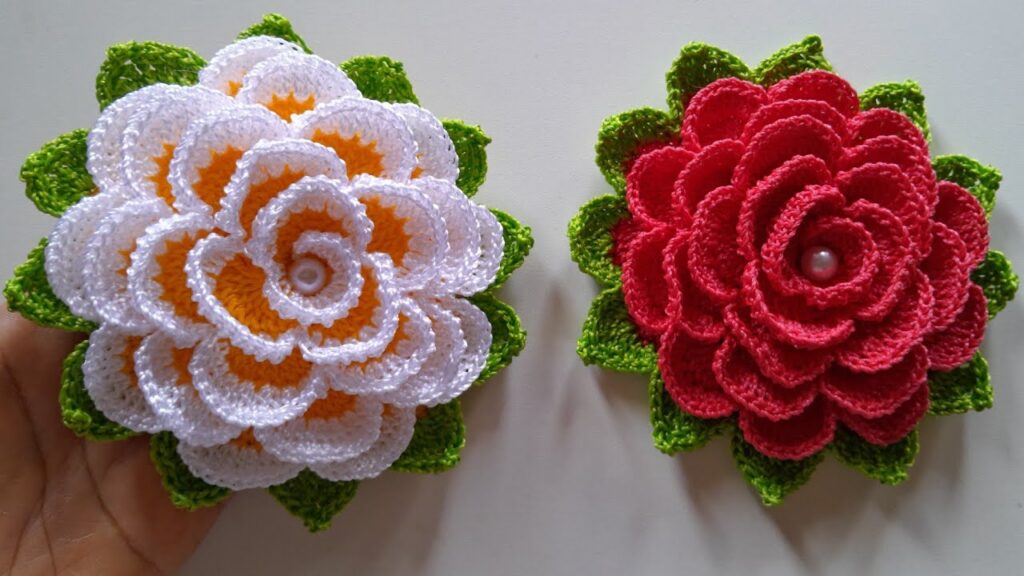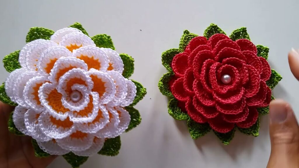 These beautiful crochet flowers are 3D layered roses with leaves — they look intricate but can be made step-by-step with basic crochet stitches. Here’s a detailed tutorial for making one like those in your image:
