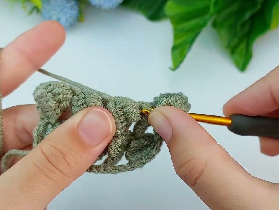 This row creates pairs of double crochet with spaces.