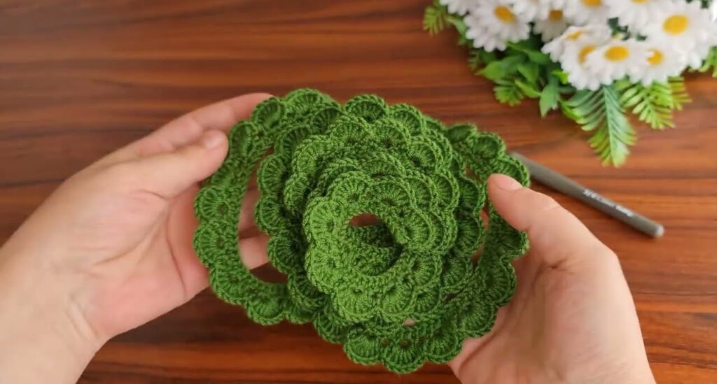 ✅ Each new row of scales will overlap slightly, forming the “tree leaf” pattern.