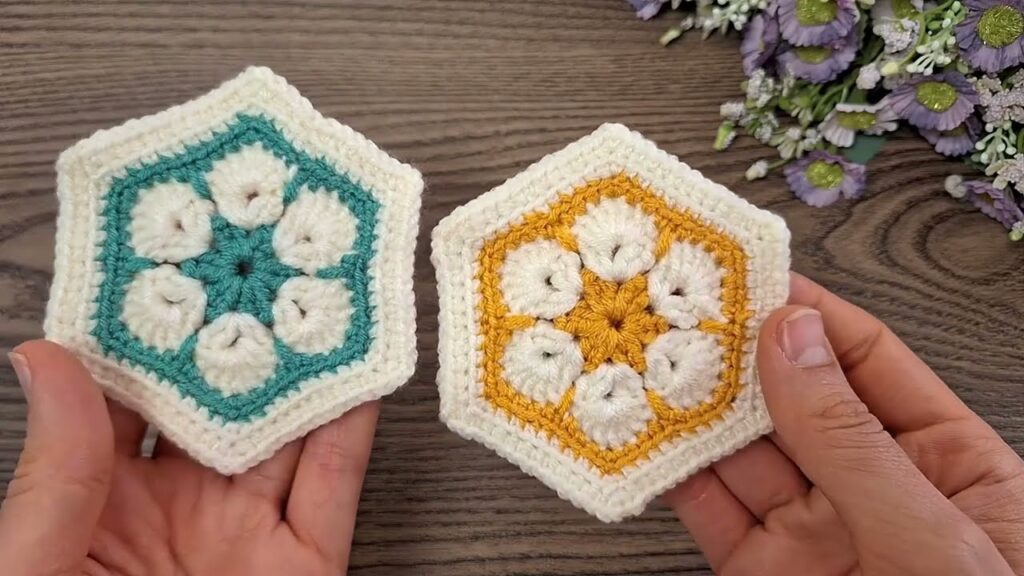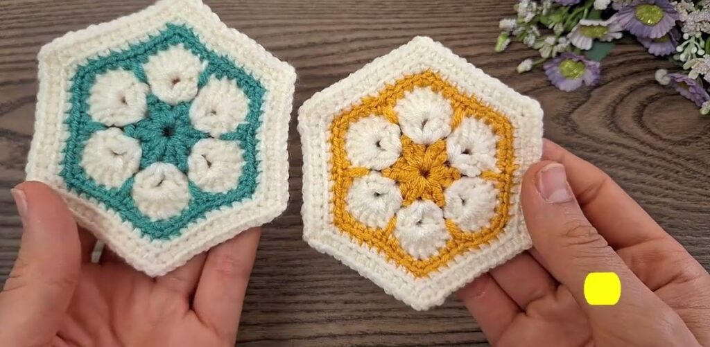 This image shows hexagon crochet motifs with a floral or puff-like center — a common design used in blankets, bags, and coasters. Here’s how to make one like in your image: