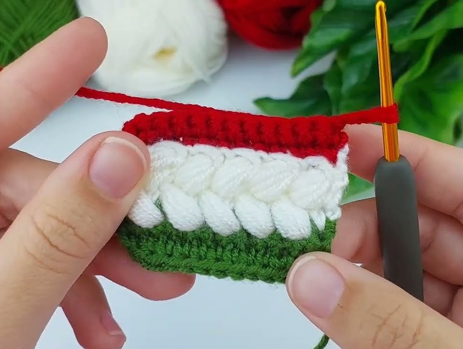 STEP 3: CONTRAST COLOR SINGLE CROCHET ROW (GREEN / RED)